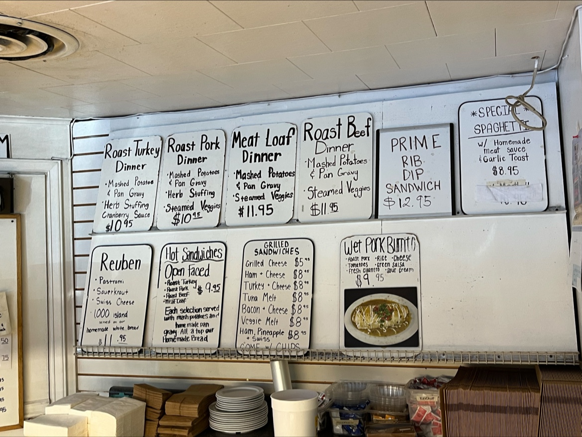The menu presents a blend of freshly baked goods and classic café favorites. Mornings are well served with warm breakfast sandwiches, flaky pastries like cinnamon rolls and strawberry danishes, and comforting specials such as biscuits and gravy. For lunch, sandwiches like the Reuben paired with fries or soups offer a casual, filling meal. Dinner choices include home-style options and creative twists such as pork chops, turkey dinners, or even a wet chicken burrito, catering to those looking for a substantial, straightforward plate.